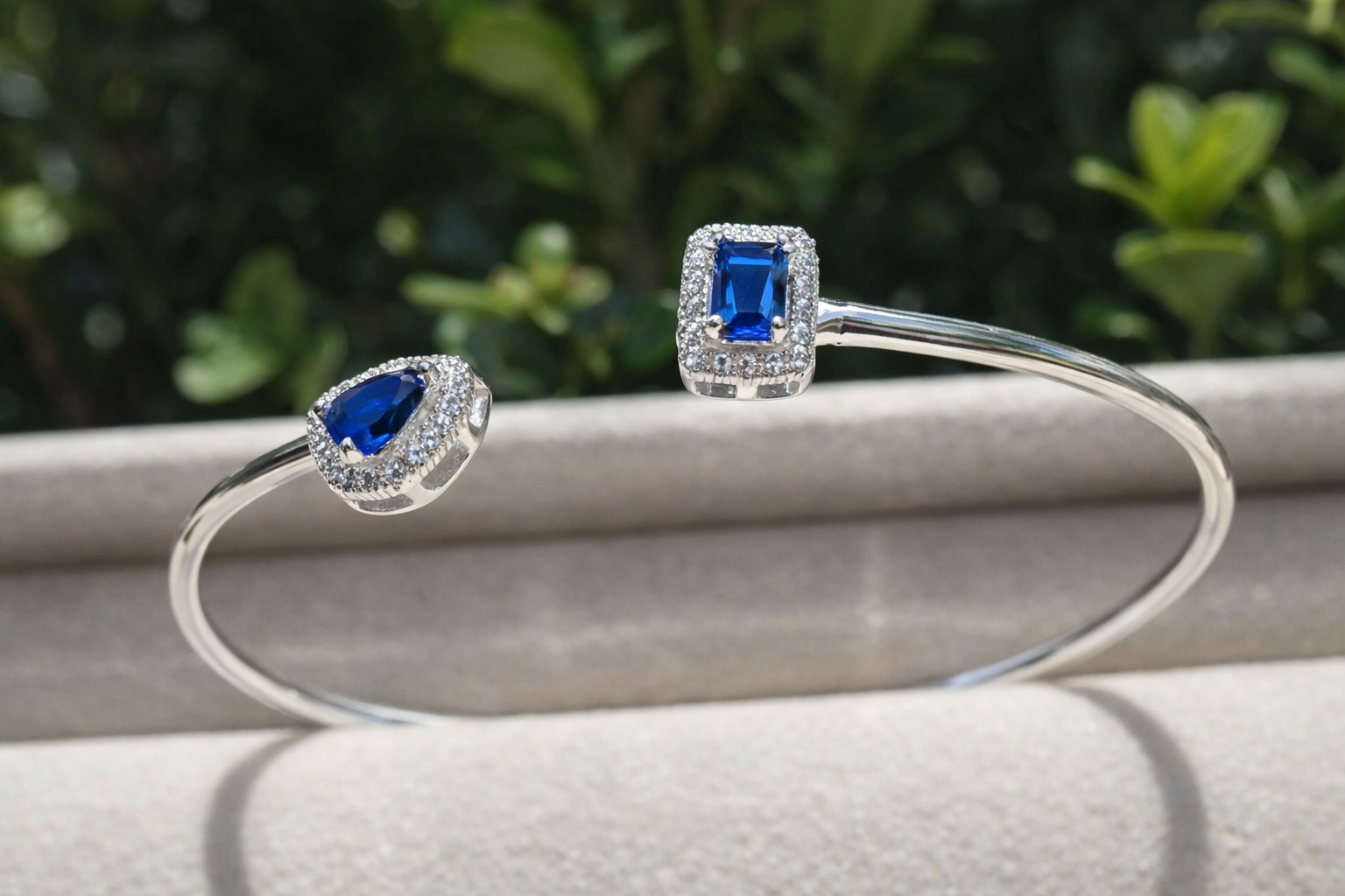 Sophisticated silver bracelet with two blue sapphire stones in distinct shapes – one teardrop and one rectangular – both framed by pavé-set cubic zirconia. Open and adjustable design that provides comfort and elegance. The intense blue stones contrast perfectly with the brilliance of the cubic zirconia, creating a luxurious and striking piece. Ideal for special occasions or to add a touch of glamour to your look.