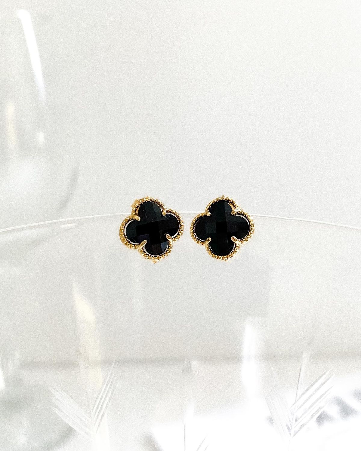 Brinco Trevo em formato de trevo da sorte com detalhes em ouro e ônix preto. Uma peça elegante e sofisticada que simboliza proteção e boa sorte, combinando design moderno com acabamento premium. Perfeito para uso diário ou ocasiões especiais, adicionando um toque de requinte ao seu visual.